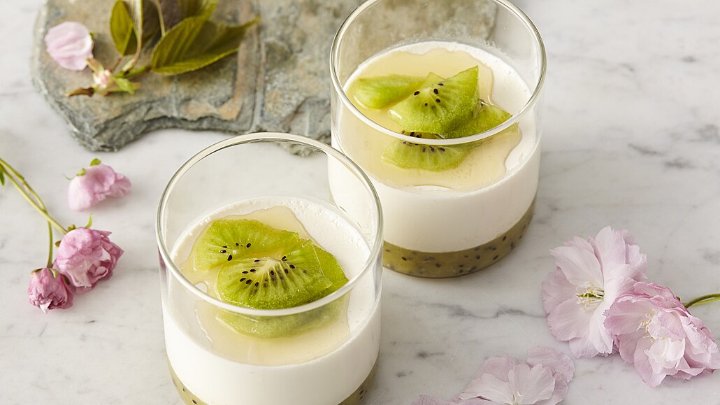 - Vyjmeme skleničky z mrazničky a navrch nalijeme smetanovou směs. Necháme 4 hodiny tuhnout v chladu. Před podáváním dozdobíme kiwi a přelijeme sirupem.