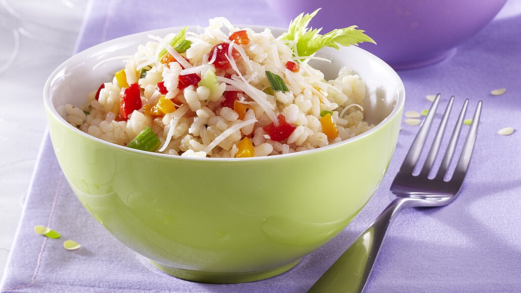 - Když je rýže téměř měkká, přidáme do hrnce papriky s rajčaty a máslo a vše dovaříme. Rizoto dochutíme solí a pepřem a odstavíme. Na talíři ho posypeme sýrem.