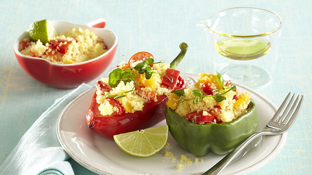 - Dvě papriky rozkrojíme, očistíme a ogrilujeme nebo opečeme. Pak je nakrájíme na menší kousky. Kuskus připravíme podle návodu na obalu a necháme vychladnout. Rajčátka omyjeme a přepůlíme. Vše dáme do salátové mísy, přidáme chilli, osolíme, opepříme a pokapeme lžící olivového oleje a limetkovou šťávou. Dobře promícháme.