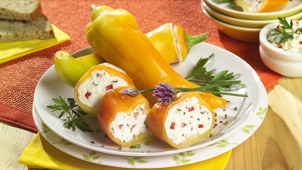 - Papriky naplníme ochuceným sýrem, uzavřeme odříznutými vršky a vložíme do lednice vychladit. Podáváme s pečivem.