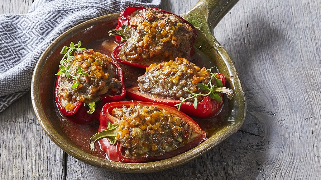 - Připravené papriky naplníme masovou směsí a vložíme do pečicí formy. Podlijeme trochou vody a vložíme do vyhřáté trouby. Pečeme při 180 °C asi 45 minut. Před podáváním můžeme dozdobit čerstvým tymiánem.