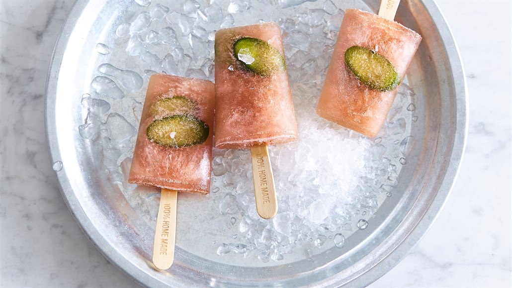 - Okurku nakrájíme na velmi slabé plátky. Až tekutina v tvořítkách začne lehce houstnout, vmáčkneme do ní plátky okurky. Uzavřeme, do otvoru ve víčku vložíme tyčky a mrazíme nejlépe do druhého dne.