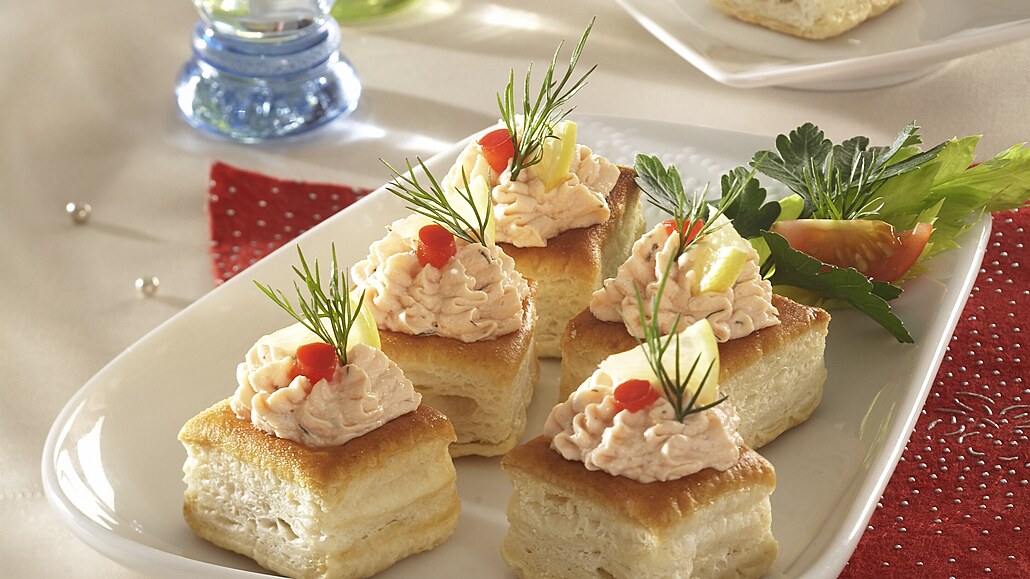 - Lososovou pěnu dáme do cukrářského sáčku s ozdobným tvořítkem a nastříkáme ji do hotových vychladlých mističek. Navrch nastříkáme krémovou čepičku. Ozdobíme paprikou, citronem a koprem.