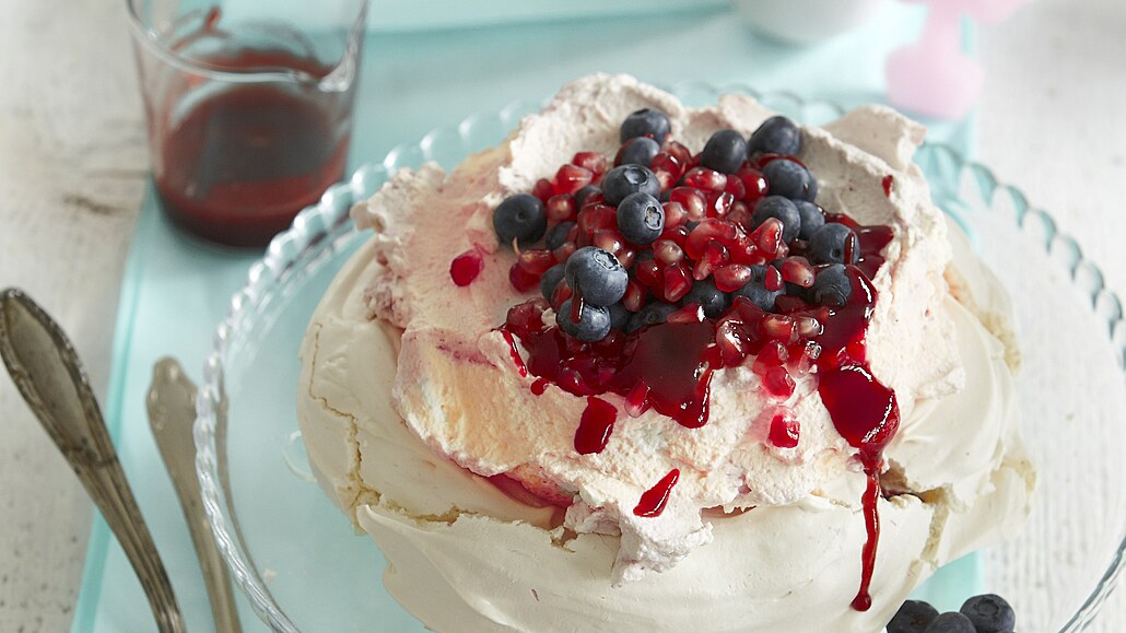 - Těsně před servírováním vyšleháme smetanu. Velmi opatrně ji promícháme se lžící malinové omáčky. Na sněhový korpus rozetřeme šlehačku. Na ni rozprostřeme semínka granátového jablka a borůvky. Po rozkrojení porce polijeme lžící malinové omáčky.