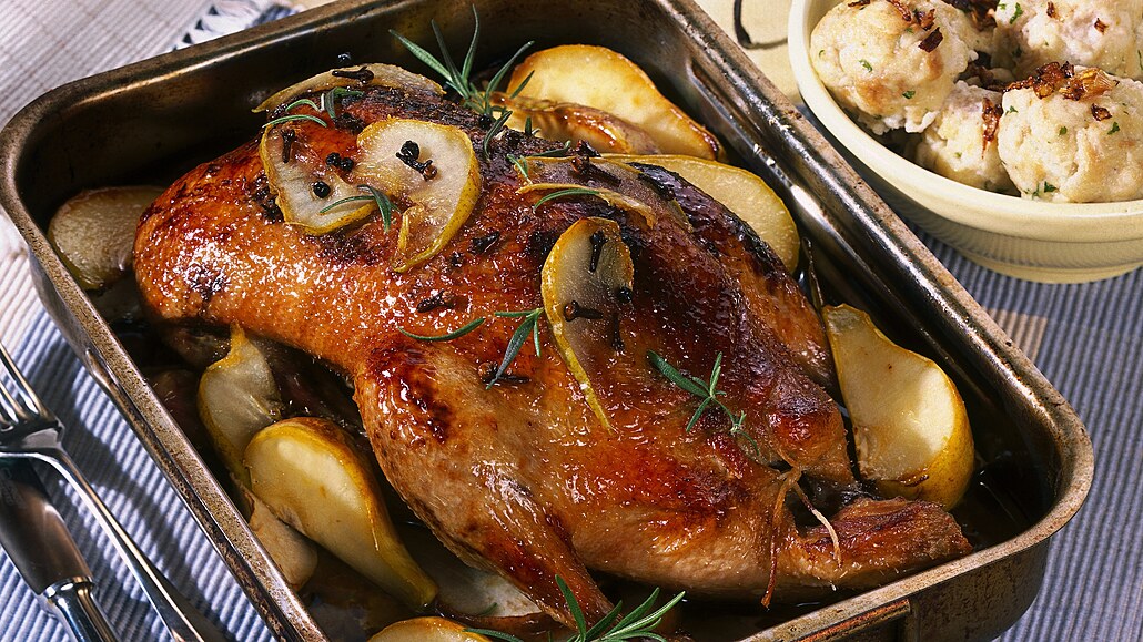 - Na dno pekáčku nasypeme nakrájenou cibuli, 10 kuliček pepře a položíme naplněnou kachnu. Přiklopíme nebo zakryjeme alobalem a vložíme do trouby rozehřáté na 160°C. Pečeme asi 30 minut, pak kachnu podlijeme trochou vody a zvolna pečeme dálší půl hodiny. Potom do pekáčku přidáme zbylé hrušky, nakrájené na osminky a několik hřebíčků. Pečeme ještě asi 45 minut.