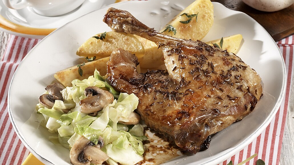 - Stehna očistíme. Osolíme je, posypeme kmínem a 30 minut necháme odležet. Cibuli oloupeme, pokrájíme nadrobno a rozprostřeme na dno pekáčku. Navrch položíme stehýnka. Přiklopíme je a vložíme do trouby vyhřáté na 190 °C zapéct.