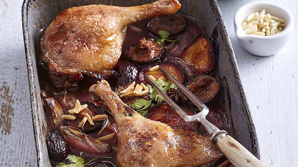 - Druhý den přendáme kachní stehna do pekáčku. Švestky (nebo blumy) omyjeme, rozpůlíme a vypeckujeme. Šalotku oloupeme, podélně rozkrojíme na čtvrtiny a společně se švestkami přidáme k masu. Pekáček vložíme do trouby vyhřáté na 180 °C a nasucho zapékáme asi 30 minut. Poté obsah pekáčku podlijeme zbylou marinádou a teplotu snížíme na 160 °C. Pečeme asi 100 - 120 minut do úplného změknutí. Během pečení přeléváme maso výpekem a podléváme dle potřeby vodou.