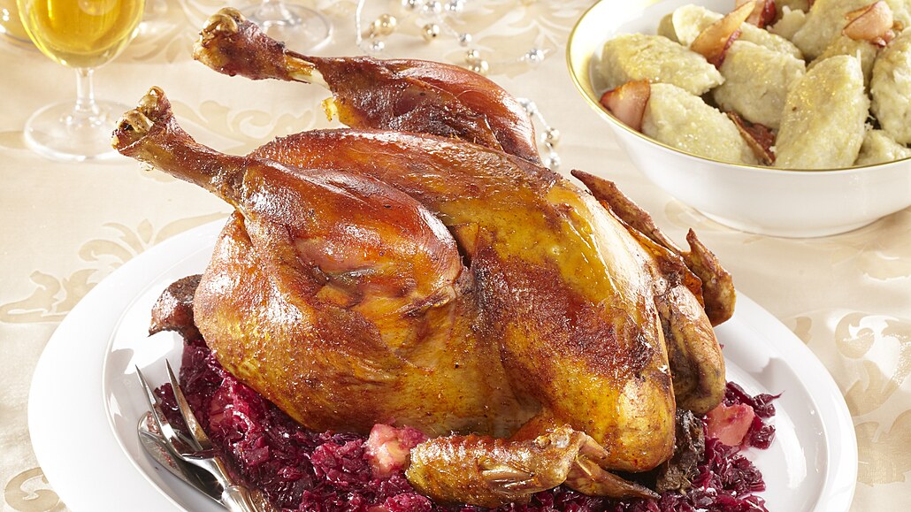 - Slaninu nakrájíme nadrobno a rozprostřeme na dno pekáče. Krůtu naplníme jablky a zašijeme. Pak ji položíme do pekáče, poklademe ji kousky másla, podlijeme trochou vody a překryjeme alobalem. V troubě ji při 170 °C necháme péct asi 3 hodiny. Během pečení ji přeléváme výpekem. Když je měkká, alobal odstraníme a necháme ji zezlátnout.