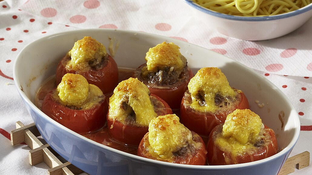 - Rajčata omyjeme, osušíme a pod špičkou vodorovně seřízneme. Lžičkou je opatrně vydlabeme a naplníme je masovou hmotou.