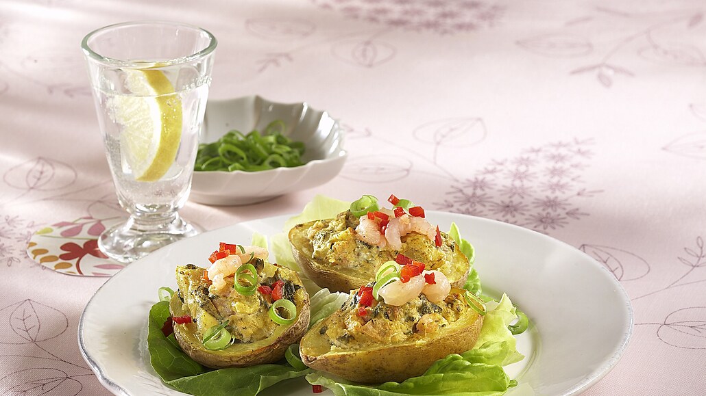 - Naplněné brambory narovnáme na vhodnou pečicí mísu. Nezakryté pečeme v mikrovlnné troubě při nejvyšším stupni 6 minut a pak je necháme ještě chvíli v troubě stát. Dozdobíme zbylými krevetkami, jarní cibulkou a a červenou paprikou. Podáváme na listech salátu.