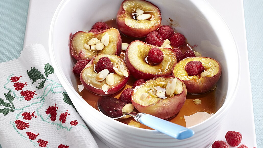 - Mandle nakrájíme na plátky. Zapečené broskve vyndáme z trouby, rozdělíme na talířky a posypeme je plátky mandlí a malinami. Podáváme s ušlehanou smetanou a šťávou vypečenou z broskví.