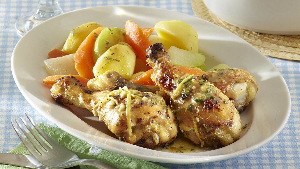 - Zeleninu vyjmeme z hrnce a rozdělíme na talíře. Podlijeme ji trochou vývaru a doplníme pečenými paličkami.