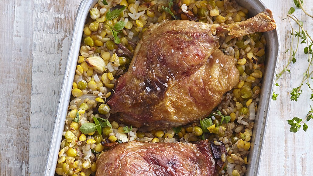 - Směs dáme do vymazané formy, navrch položíme dobře osolená kachní stehna, přikryjeme poklicí nebo alobalem a pečeme při 160°C asi 120 minut. Pak odstraníme poklici a pečeme při 200 °C asi 20 minut, aby se vypekla kůže z kachny a na šouletu se udělala kůrka.