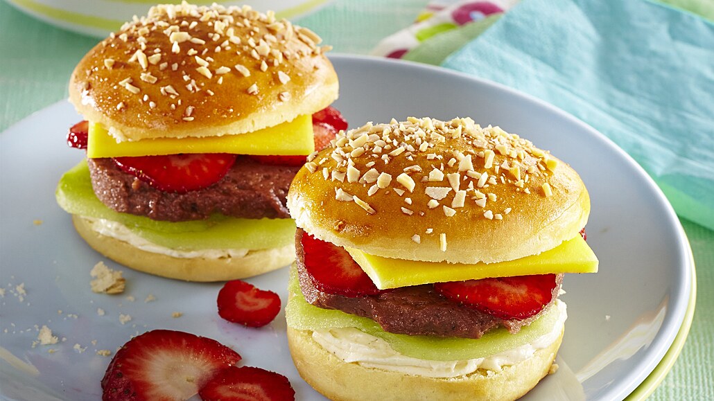 - Ovoce omyjeme, očistíme a nakrájíme na plátky. Mango seřízneme do čtverce, aby více připomínalo sýr. Ze ztuhlé nutellové hmoty vykrájíme kolečka. Vychladlé kobližky podélně rozpůlíme, potřeme vanilkovým dezertem, poklademe ovocem a kolečkem nutelly. Přiklopíme druhou půlkou kobližku a podáváme.