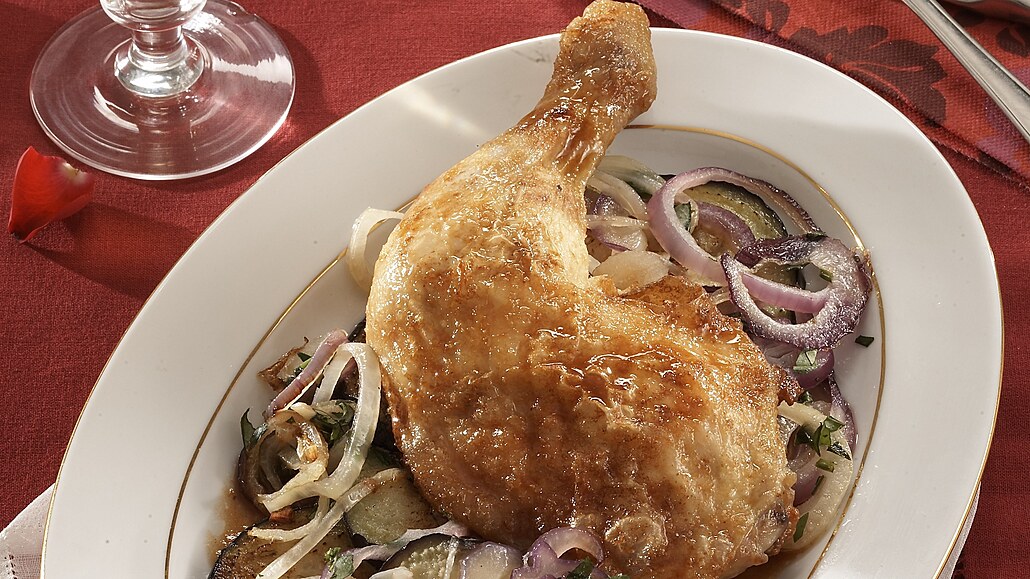 - Když je kuře téměř měkké, rozehřejeme na pánvi olej a zprudka na něm opečeme lilek. Vyjmeme ho a do pánve vsypeme cibuli s česnekem. Když zezlátnou, vrátíme k nim lilek. Vše osolíme a zasypeme bylinkami.