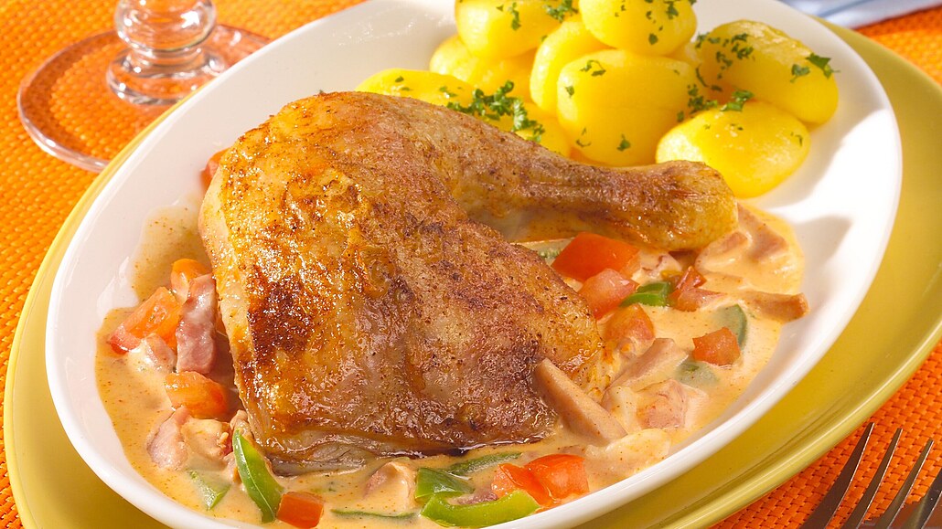 - Omytá rajčata a očištěné papriky pokrájíme nadrobno. Přidáme do kastrůlku, vše zalijeme výpekem z kuřete a dusíme. Nazávěr omáčku zahustíme moukou rozmíchanou v jogurtu, dochutíme solí, pepřem a ještě 10 minut povaříme. Porce kuřete podáváme přelité omáčkou a s bramborem.