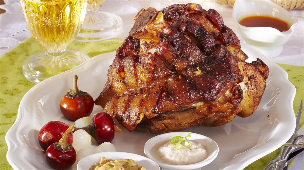 - Kůži na kolenech nařežeme do mřížky a potřeme prolisovaným česnekem a grilovacím kořením. Vložíme je do pekáčku, podlijeme pivem a trochou vývaru z masa a v troubě necháme při 180 °C péct. Průběžně je přeléváme výpekem, popřípadě podléváme dalším vývarem.