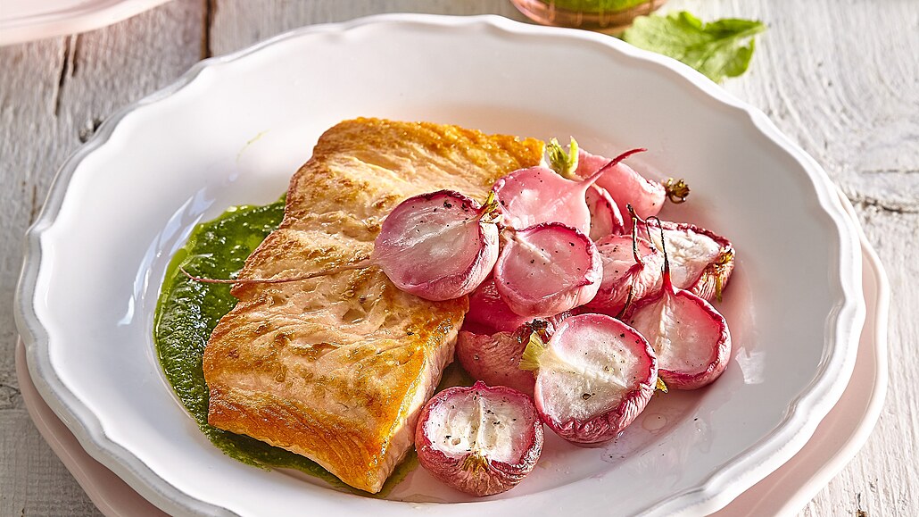 Pečené ředkvičky s lososem a pestem z ředkvičkových listů