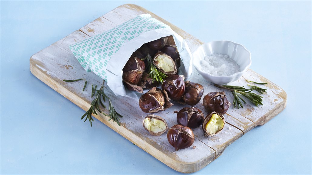 - 3. Poté je rozložíme na plech s pečicím papírem tak, aby byly naříznutou stranou nahoru. Pečeme je ve vyhřáté troubě při 220 °C asi 35-45 minut (podle velikosti kaštanů). Upečené kaštany před podáváním ještě jednou osolíme a podáváme teplé.