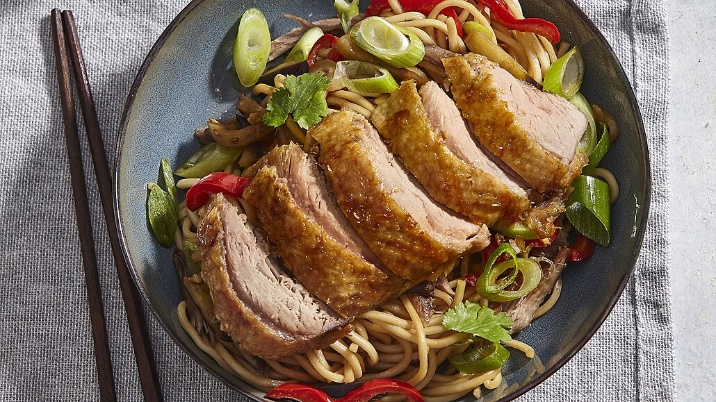 - Nakonec přisypeme k nudlím jarní cibulku. Před podáváním kachní prsa nakrájíme na plátky, na talíř nandáme nudle a kachní prsa na ně poklademe.