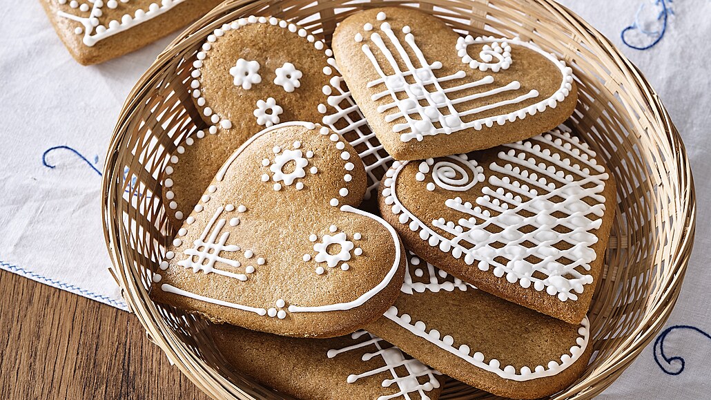 - Odleželé těsto rozválíme na pomoučněném vále na plát o síle asi 4 mm, ze kterého pomocí vykrajovátka vypícháme srdce o velikosti cca 12 cm. Vykrájená srdce pokládáme na plech s pečicím papírem. Mezi jednotlivými kusy necháváme rozestupy, perníčky pečením zvětší svůj objem. Pečeme v troubě předehřáté na 170 °C asi 10 – 12 minut dozlatova.