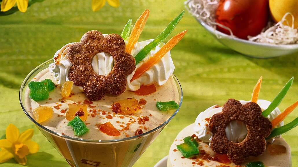 - Nakonec do hmoty zlehka vmícháme nahrubo nastrouhaný perník, usekané oříšky a nadrobno nakrájené kandované ovoce. Naplníme do pohárů a necháme vychladit. Podáváme ozdobené šlehačkou, kandovaným ovocem a sušenkami.