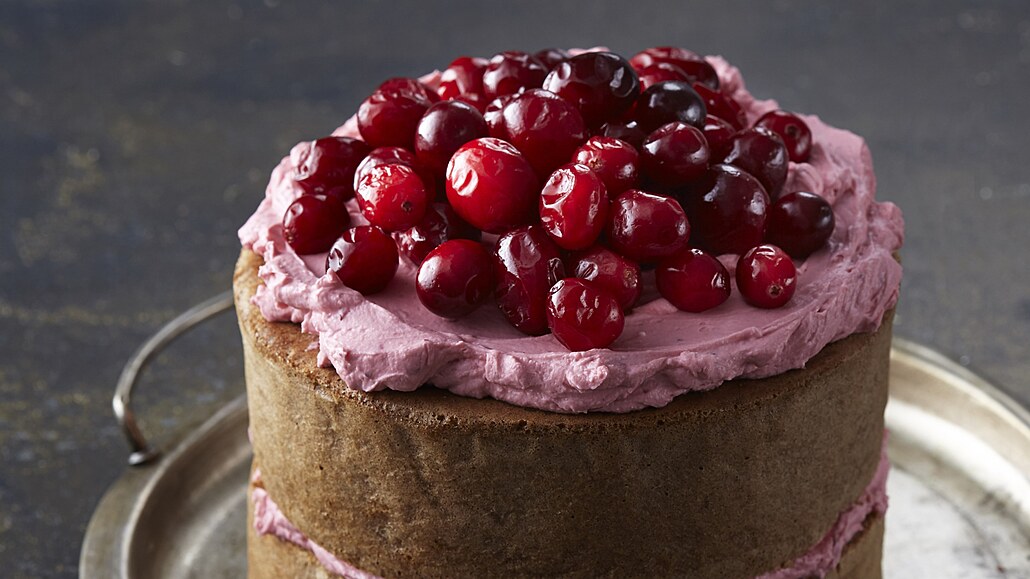 - Na servírovací tác položíme korpus, na něj rozetřeme menší polovinu krému a přiklopíme druhým korpusem. Na něj rozetřeme zbytek krému a dozdobíme zbytkem rozmražených brusinek.