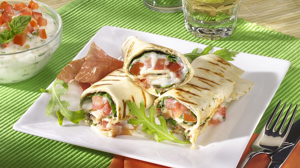 - Zakysanou smetanu smícháme s pestem. Tortily rozprostřeme a namažeme smetanovou směsí, na kterou položíme plátky parmské šunky a posypeme strouhaným parmezánem. Přidáme rukolu a vydlabaná, nakousky nakrájená rajčata.