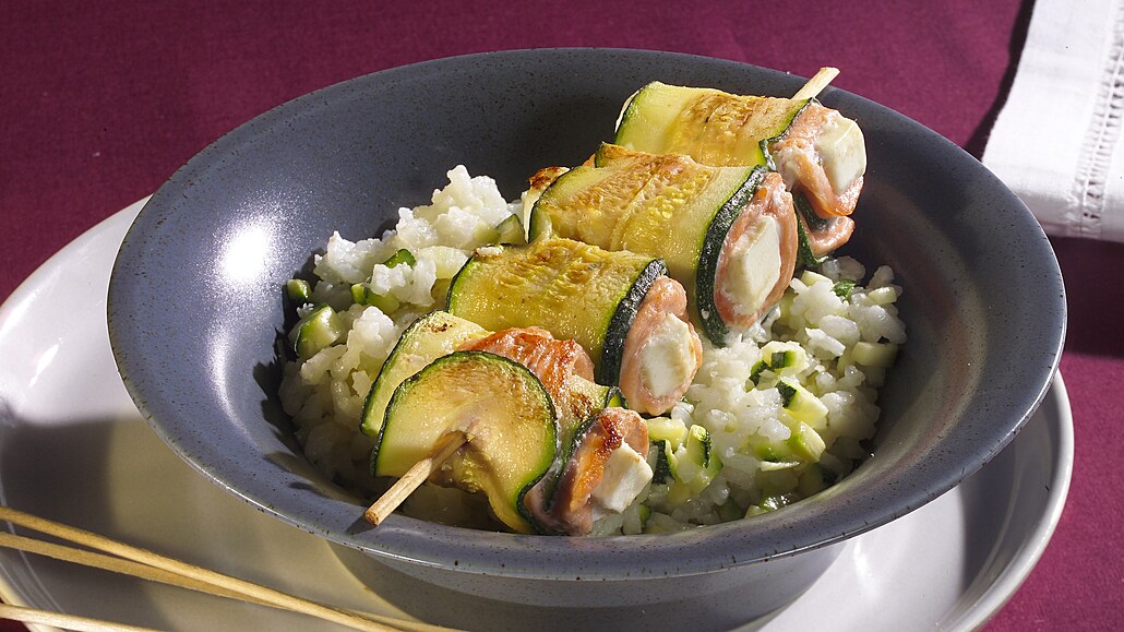 - Závitky napícháme na špízy, krátce je opečeme na oleji a necháme dojít v troubě při 160 °C asi 5 minut.