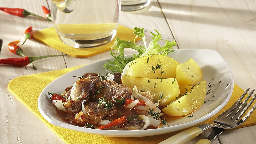 - Kachní maso vyjmeme a na výpeku zpěníme nadrobno nakrájenou cibuli a chilli papričky.