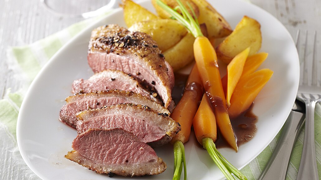 - Prsíčka vyndáme a necháme na teplém místě asi 8 minut dojít. Karotku prohřejeme na pánvi s rozehřátým máslem. Šťávu z masa přilijeme do omáčky, kterou podle chuti osladíme. Na talíře rozdělíme karotku, přidáme omáčku, na plátky nakrájené maso a doplníme vhodnou přílohou - opečené brambory nebo kroketky.