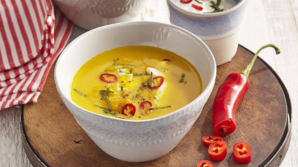 - Směs pak zalijeme 1200 ml vody, osolíme a na mírném ohni vaříme dalších 10 minut. Nakonec přidáme limetkovou šťávu, rozmixujeme, dochutíme solí a pepřem a odstavíme. Pro intenzivnější chuť před podáváním posypeme čerstvými bylinkami, chilli papričkou a zjemníme zakysanou smetanou.