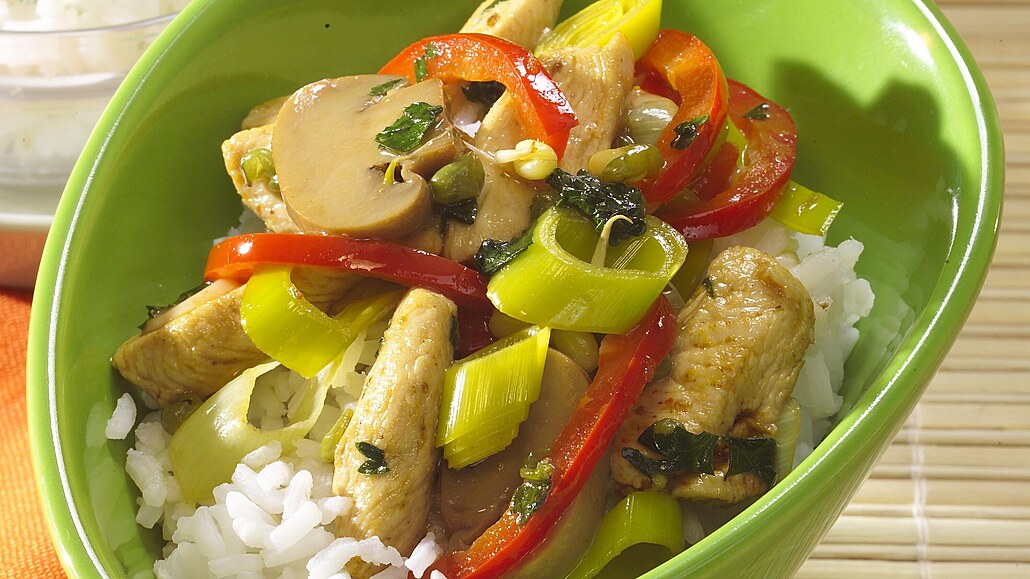 - Kuřecí maso opláchneme, osušíme a nakrájíme na nudličky. Posypeme je směsí koření na čínu. Pórek důkladně omyjeme a nakrájíme na kolečka. Očištěnou červenou papriku rozkrájíme na proužky, oloupaný česnek na plátky, zelenou petrželku usekáme nadrobno a žampiony nakrájíme na plátky.