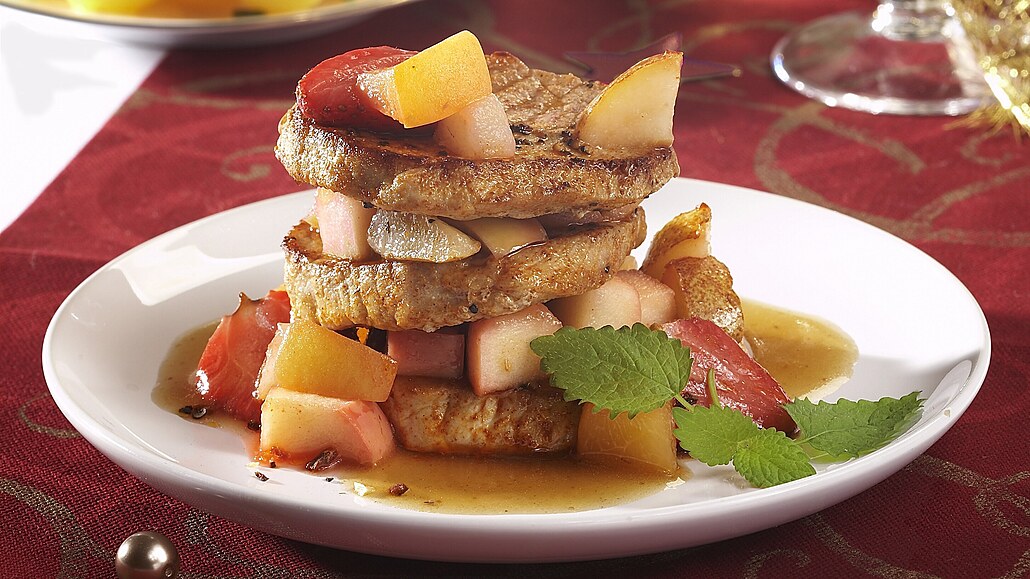 - Medailonky proložíme ovocem, vzniklou pyramidku spíchneme špejlí nebo párátkem a v troubě nebo pod grilem prohřejeme. Na talířích přelijeme výpekem ochuceným šťávou z kompotu.Vhodnou přílohou jsou brambory.