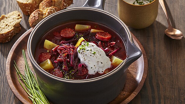 - Vaříme asi 20 minut, přidáme opečenou klobásu a krátce prohřejeme, dochutíme octem a vyjmeme koření. Podáváme se smetanou a pažitkou.