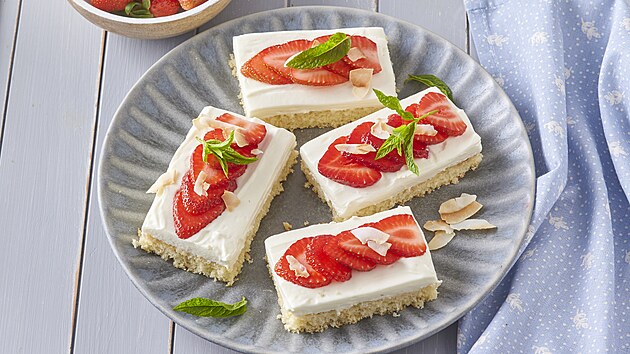 - Tvaroh, mascarpone, smetanu a cukr vyšleháme v hladký krém. Rozetřeme ho navrch zchladlého piškotového plátu. Navrch rozložíme očistěné jahody a můžeme ještě potřít např. rozehřátým džemem nebo medem.