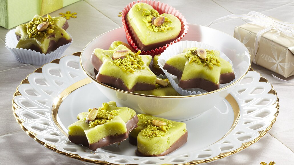 - Pistáciové a piniové oříšky nastrouháme nebo umeleme najemno. Společně s prosátým moučkovým cukrem je zapracujeme do marcipánové hmoty.