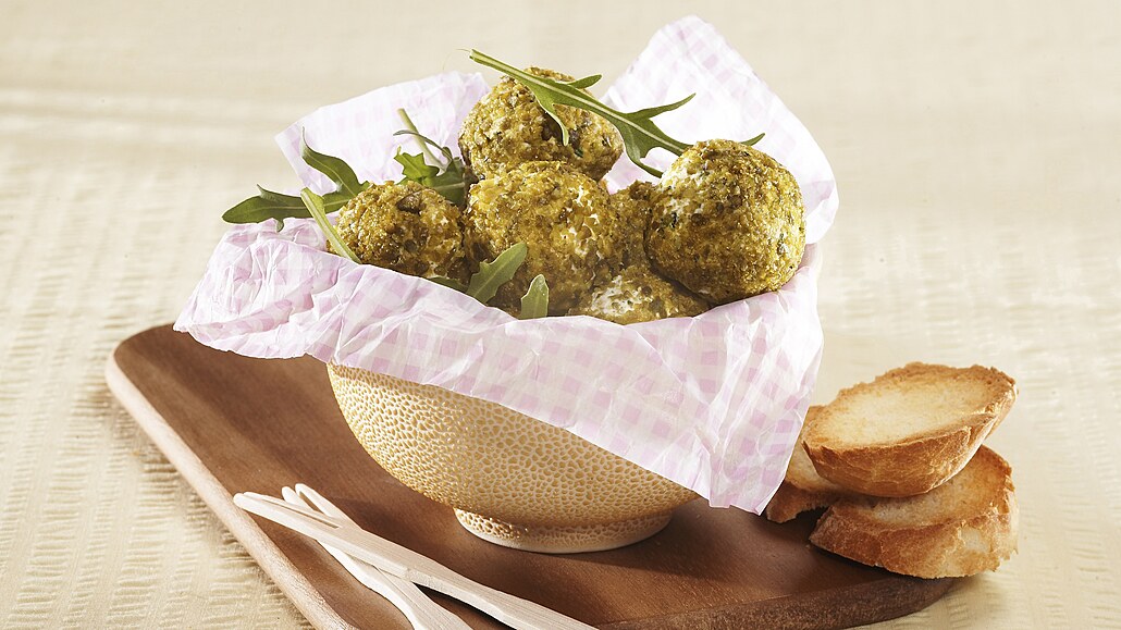 - Z pistáciové hmoty tvoříme menší kuličky, které obalíme ve zbylých pistáciích a necháme je opět ztuhnout. Podáváme je s opečenými tousty a zdobíme rukolou.