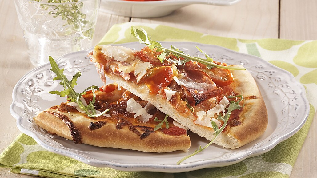 - Vykynuté těsto znovu propracujeme a rozválíme na pomoučněném válu na kulatý plát, silný asi 5 mm. Přeneseme ho na plech vyložený pečicím papírem a rovnoměrně potřeme vrstvou rajčatové omáčky. Položíme na kolečka nakrájenou mozzarellu (suchou mozzarellu můžeme i nastrouhat), na kterou rozprostřeme parmskou šunku a překrojená rajčátka. Posypeme parmazánem a pečeme ve vyhřáté troubě při 220 °C asi 10 minut. Nakonec upečenou pizzu posypeme rukolou a podáváme.