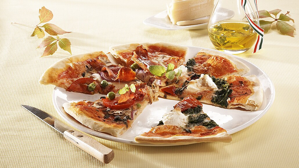 - Na rajčatový základ rozdělíme listy špenátu, prosciutto, sušená okapaná rajčata, plátky žampionů, proužky cibulky a kousky ricotty. Oblohu posypeme hráškem. Pečeme v troubě předehřáté na 220 °C asi 10 minut, až okraje pizzy zezlátnou.