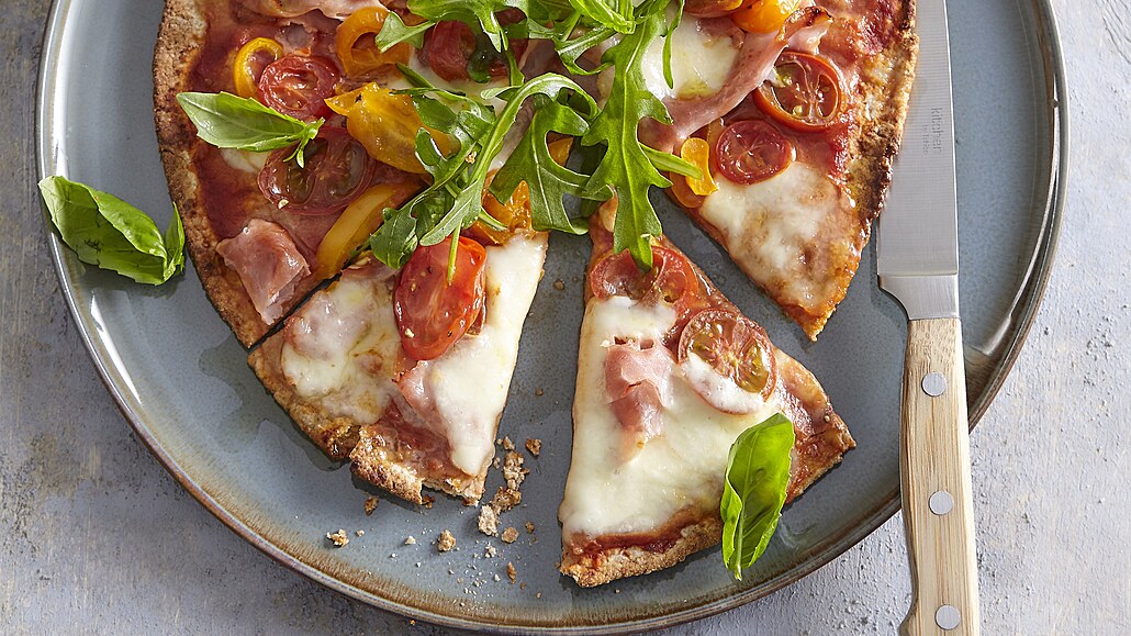- Hotové pizzy rozkrájíme na dílky a posypeme čerstvou bazalkou a rukolou.