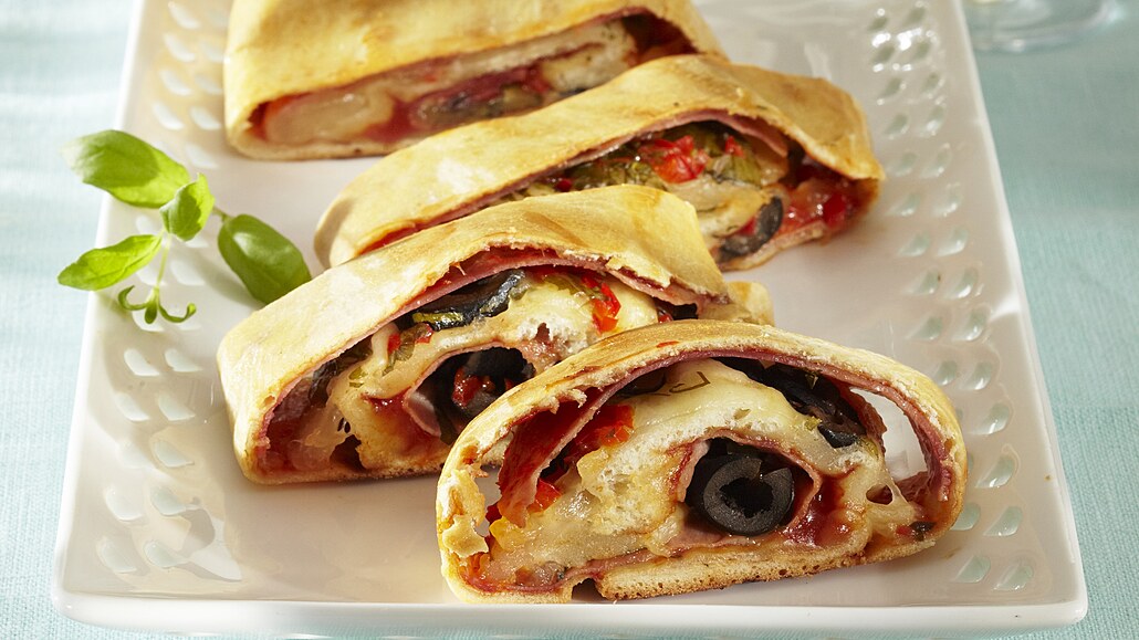 - Vykynulé těsto rozválíme na tenký obdélníkový plát. Potřeme ho kečupem, posypeme kořením a poklademe uzeninou a sýrem. Navrch ho posypeme nasekanou cibulkou a olivami.