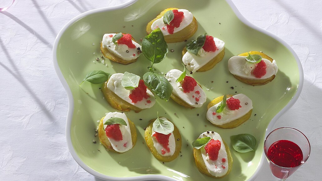 - Mozzarellu necháme okapat a nakrájíme ji na plátky, které rozdělíme na brambory. Na mozzarellu dáme kávovou lžičkou creme fraiche a červený kaviár.