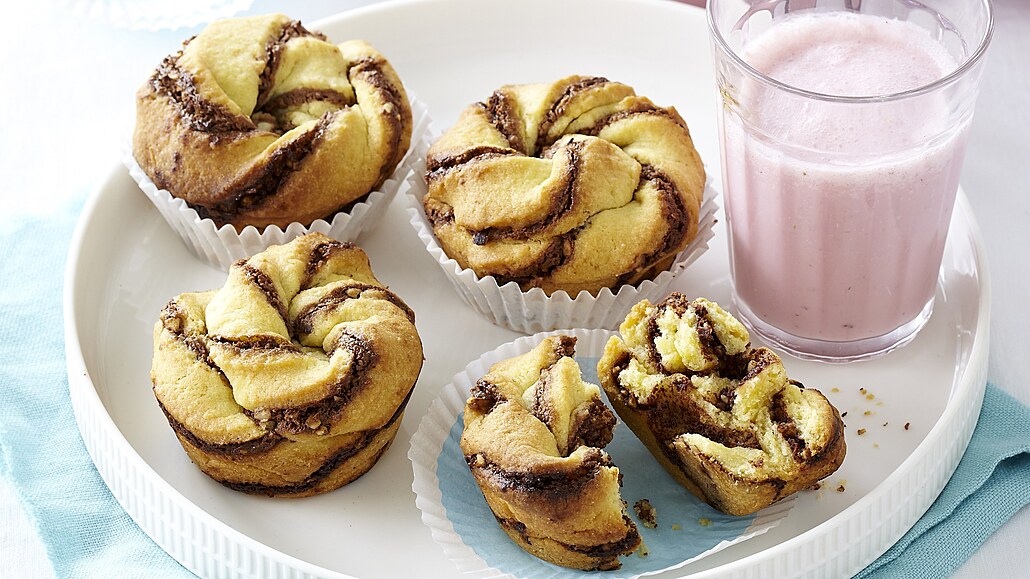 - Stočíme je postupně do spirál a zamotáme do tukem vymazaných formiček na muffiny. Pečeme v troubě předehřáté na 180 °C asi 25minut. Po upečení necháme krátce zchladnout ve formičkách a pak vyklopíme.