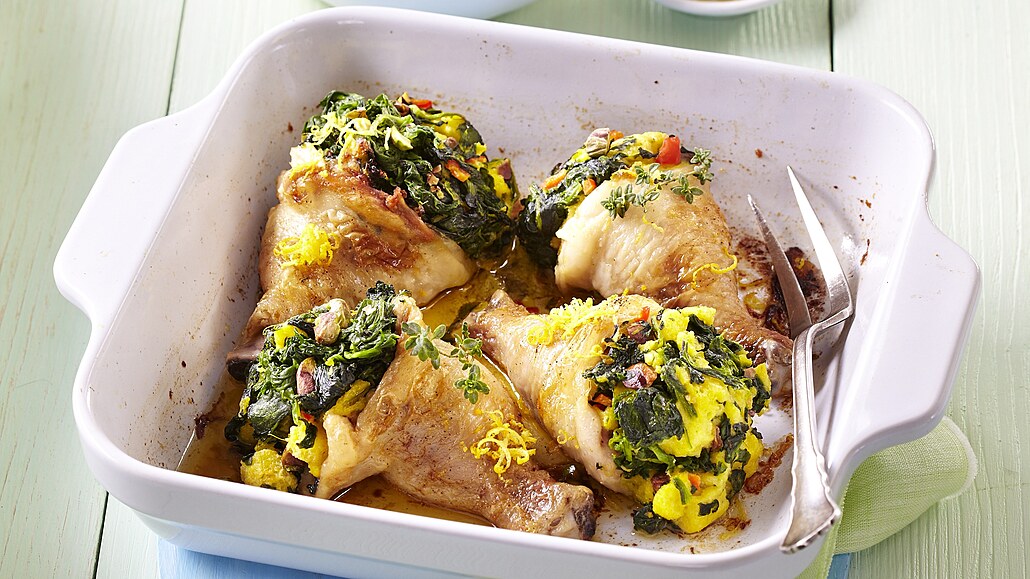 - Vykostěné kuřecí stehno naplníme špenátovou nádivkou a vložíme do pekáče. Přidáme máslo, lehce pokapeme citronovou šťávou a posypeme nastrouhanou citronovou kůrou. Posypeme tymiánem, podlijeme vínem a osolíme. Pečeme ve vyhřáté troubě při 180 °C doměkka. Podáváme s rýží.