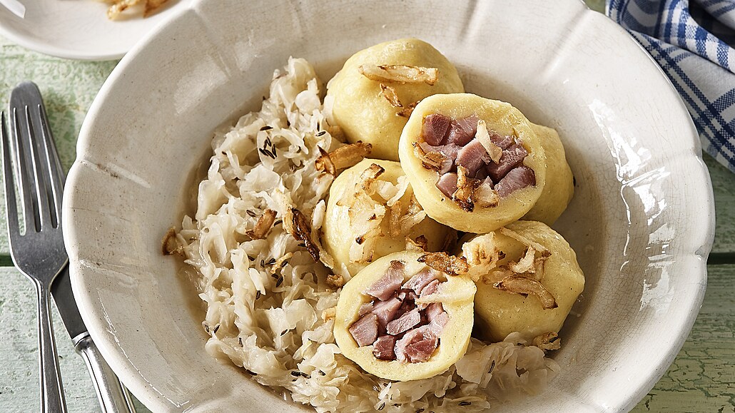 - Cibuli oloupeme a nakrájíme na nudličky. Obalíme ji v mouce a v kastrůlku ve vyšší vrstvě rozpáleného oleje usmažíme dozlatova. Hotové knedlíky vyjmeme z vody, necháme okapat a dáme do mísy. Podáváme je s dušeným kysaným zelím a křupavou cibulkou.