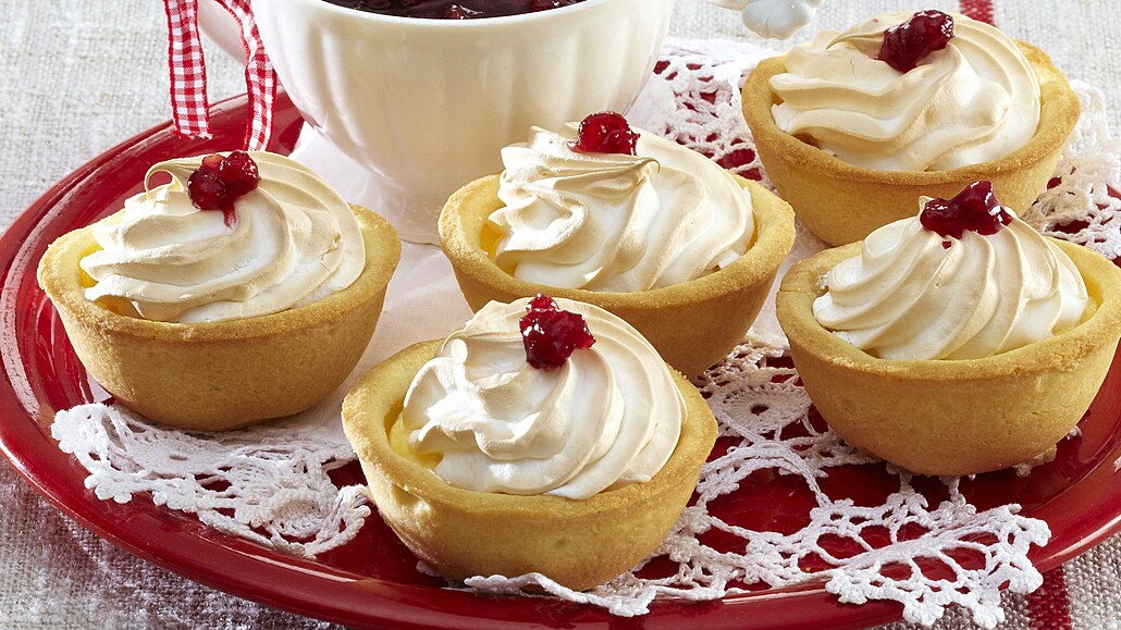 - Bílky vyšleháme s cukrem a citronovou šťávou v pevný sníh. Naplníme jím cukrářský sáček s širokou řezanou trubičkou a nastříkáme ho na upečené plněné košíčky. Poté je dáme znovu do trouby a necháme je při 200 °C zapéct dozlatova. Necháme je vychladnout a podáváme s brusinkami.