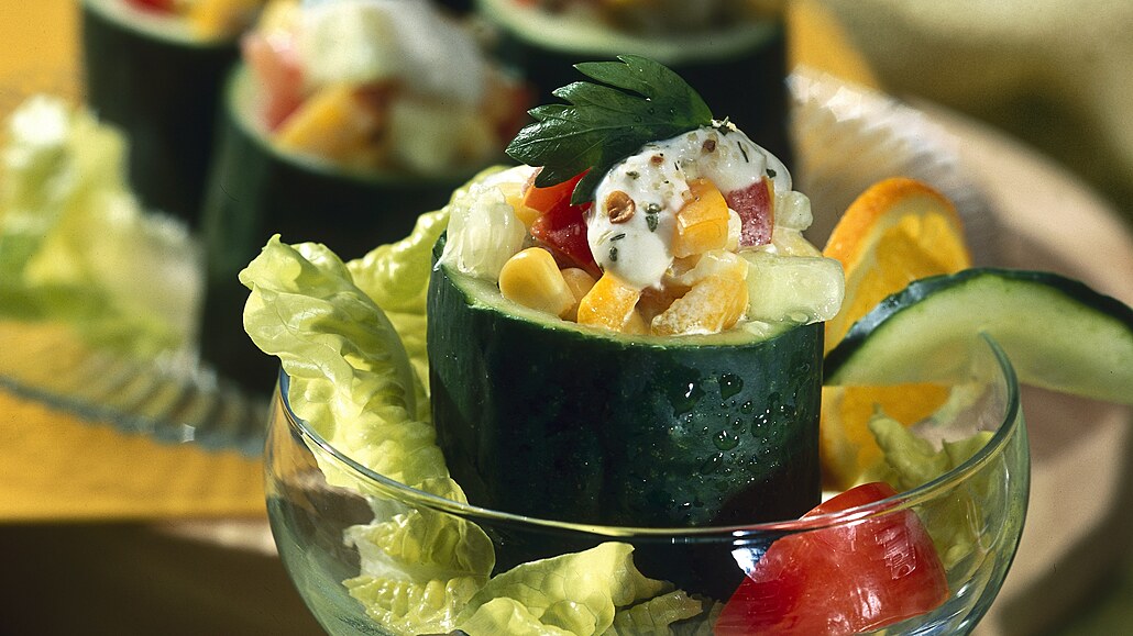 - Salátovou směsí naplníme připravené okurkové soudky a vložíme je do lednice asi na půl hodiny vychladit. Vychlazené je přelijeme rokfórovým dresinkem a ozdobíme listy hlávkového salátu a lístkem celeru.