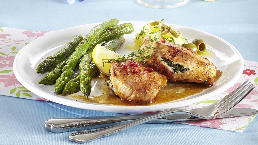 Vůně bylinek, jemné telecí maso a křupavý chřest, to jsou hlavní devizy tohoto lehce slavnostního pokrmu, který je ideální pro romantické posezení ve dvou.