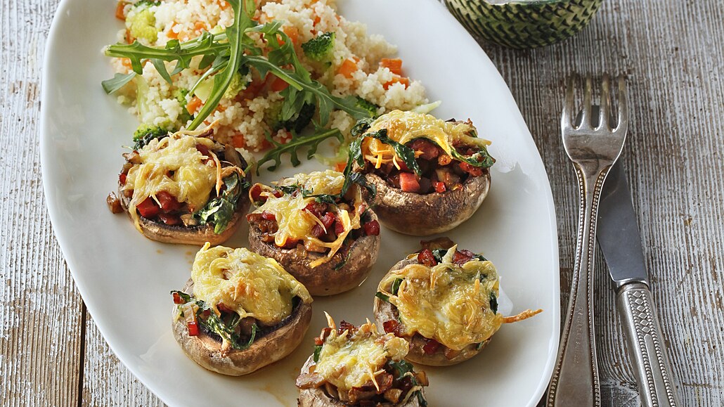 - Mezitím připravíme kuskus. V rendlíku nahřejeme polovinu oleje a krátce v něm osmahneme jemně pokrájenou cibuli s kostičkami mrkve, osolíme, zalijeme 250 ml vody a dusíme pár minut doměkka. Potom přisypeme drobné růžičky brokolice, zalijeme horkou vodou tak, aby byla veškerá zelenina ponořená. Vaříme asi 2 minuty. Pak přisypeme kuskus, přilijeme zbylý olej a přivedeme k varu. Odstavíme z ohně, přiklopíme pokličkou a necháme 15 minut odležet. Plněné žampiony podáváme s kuskusem.